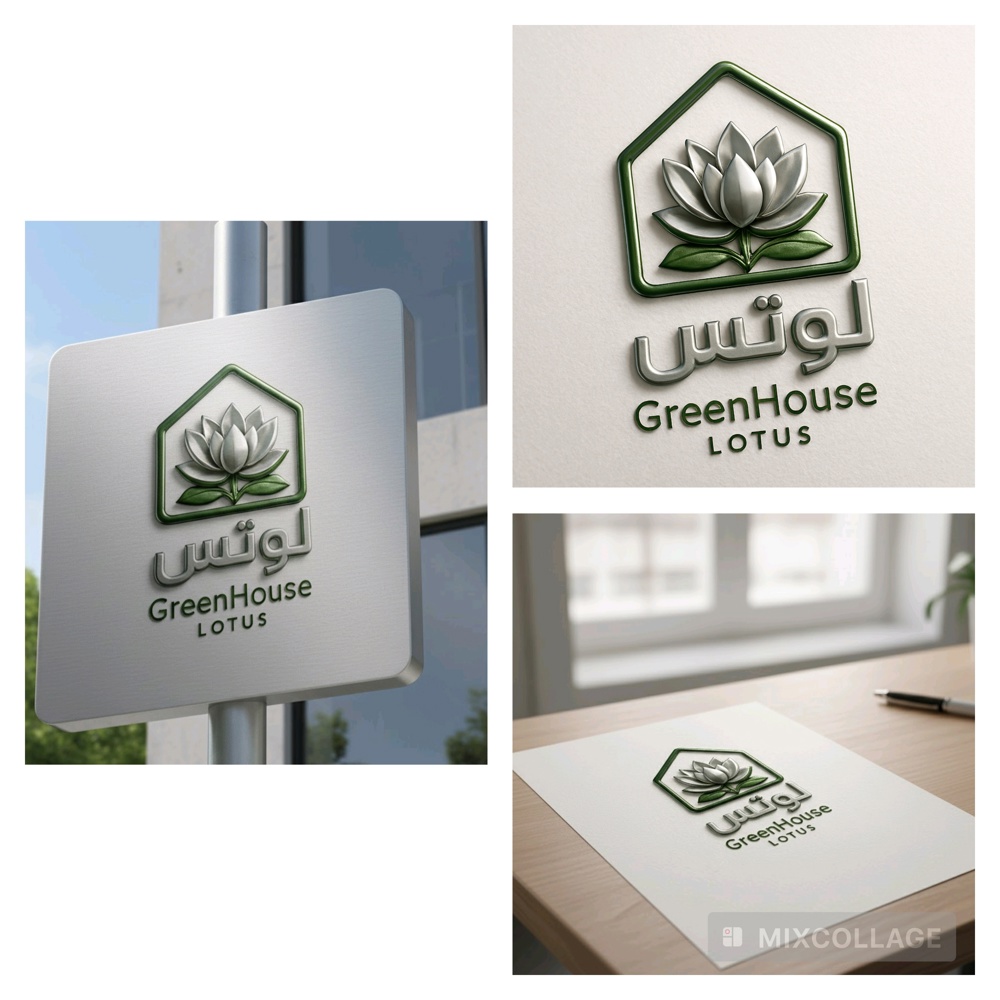 طراحی لوگوی اختصاصی برای برند "GreenHouse Lotus" با الهام از گل لوتوس و تلفیق آن با فرم گلخانه، با سبک سهبعدی و مدرن برای نمایش هویت بصری برند.