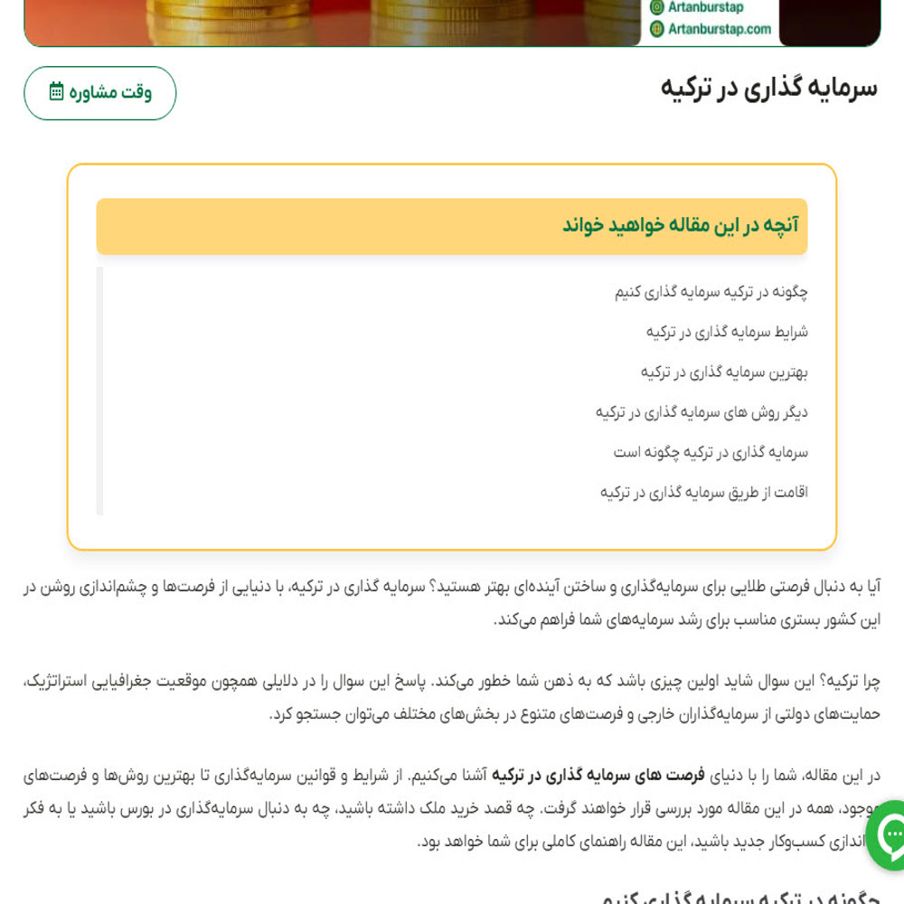 نگارش رپورتاژ خبری، رپورتاژ آگهی با هدف معرفی سایت آرتان بورس تاپ این نمونه کار بخش کوچکی از تولید و ویرایش بیش از 200 محتوای وبسایت و رپورتاژ آگهی در زمینه مهاجرت تحصیلی و کاری است. همه آنها موجب رشد سئو سایت آرتان بورس تاپ شدند.