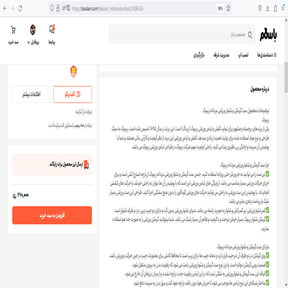 نمونهای از توضیح محصول منتشر شده در سایت باسلام
