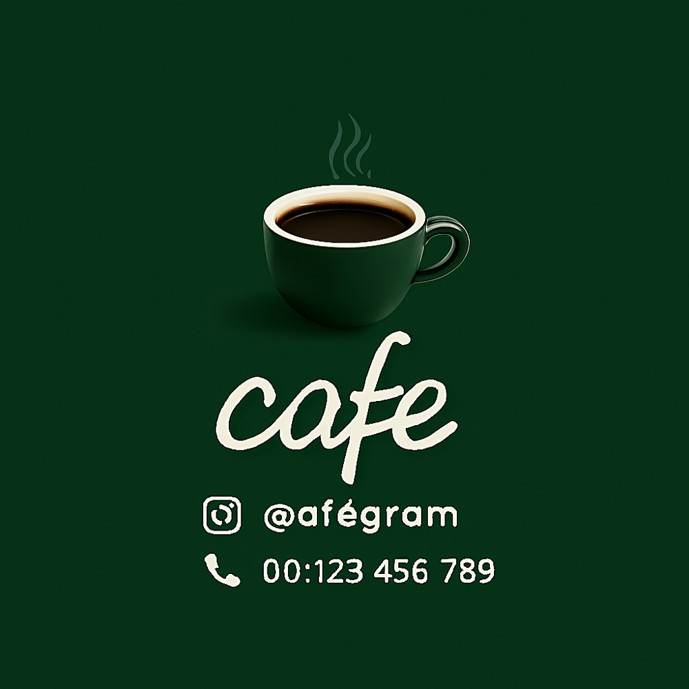 کارت ویزیت کافه آماده است - فنجان واقعی سبز تیره همچنان در مرکز توجهه، با بخار ملایم و حس گرم و دعوتکننده. - فونت دستنویس «café» با رنگ کرم روشن روی زمینه سبز تیره، تضاد زیبایی ایجاد کرده. - آیکون اینستاگرام و شماره تماس در پایین لوگو اضافه شدهاند، با رنگ کرم هماهنگ و فونت خوانا، مناسب برای چاپ و فضای دیجیتال.